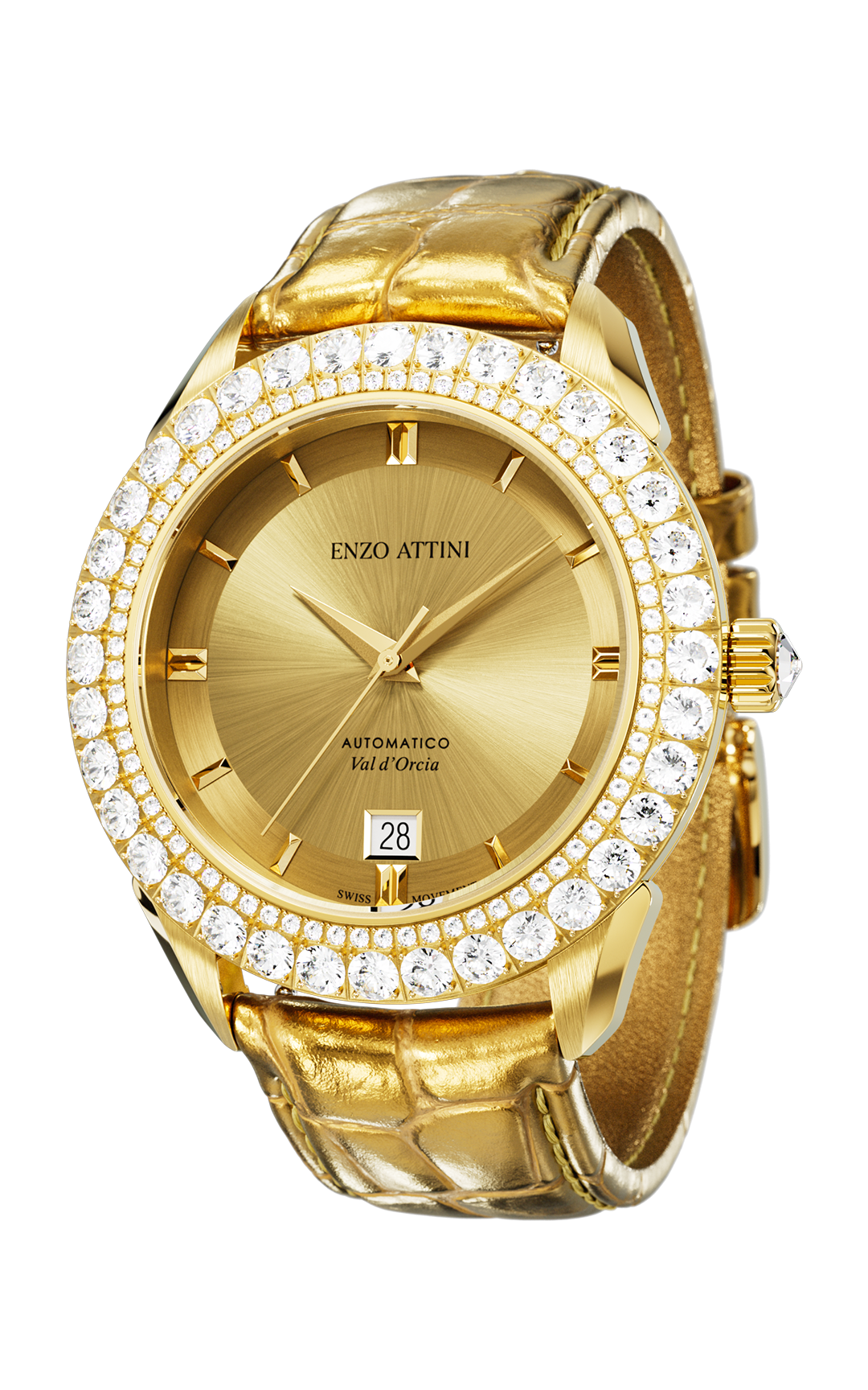 • CASE: Gold color (18k gold plated) , size 40mmx10.4mm, stainless steel material 316L • CRYSTAL: Sapphire Glass with anti-reflective coating • DIAL: Cooper with hand-applied polished markers • MOVEMENT: Swiss made, Automatic, Mechanical Movement, Frequency 28'800 A/h (4 Hz), Power Reserve 38 h, Jewels 26 pcs • FUNCTIONS: Hour, Minutes & Date • WATER RESISTANCE: up to 5 ATM • STRAP:Italian Leather strap (croc pattern), Gold color, size 20mmx18mm, adjustable, fits best for 14-23cm wrists. • BOX: Certificate of Authenticity has a unique serial number which guarantee you own a unique and original timepiece, Premium Packaging, Box dimensions 115x115x95mm